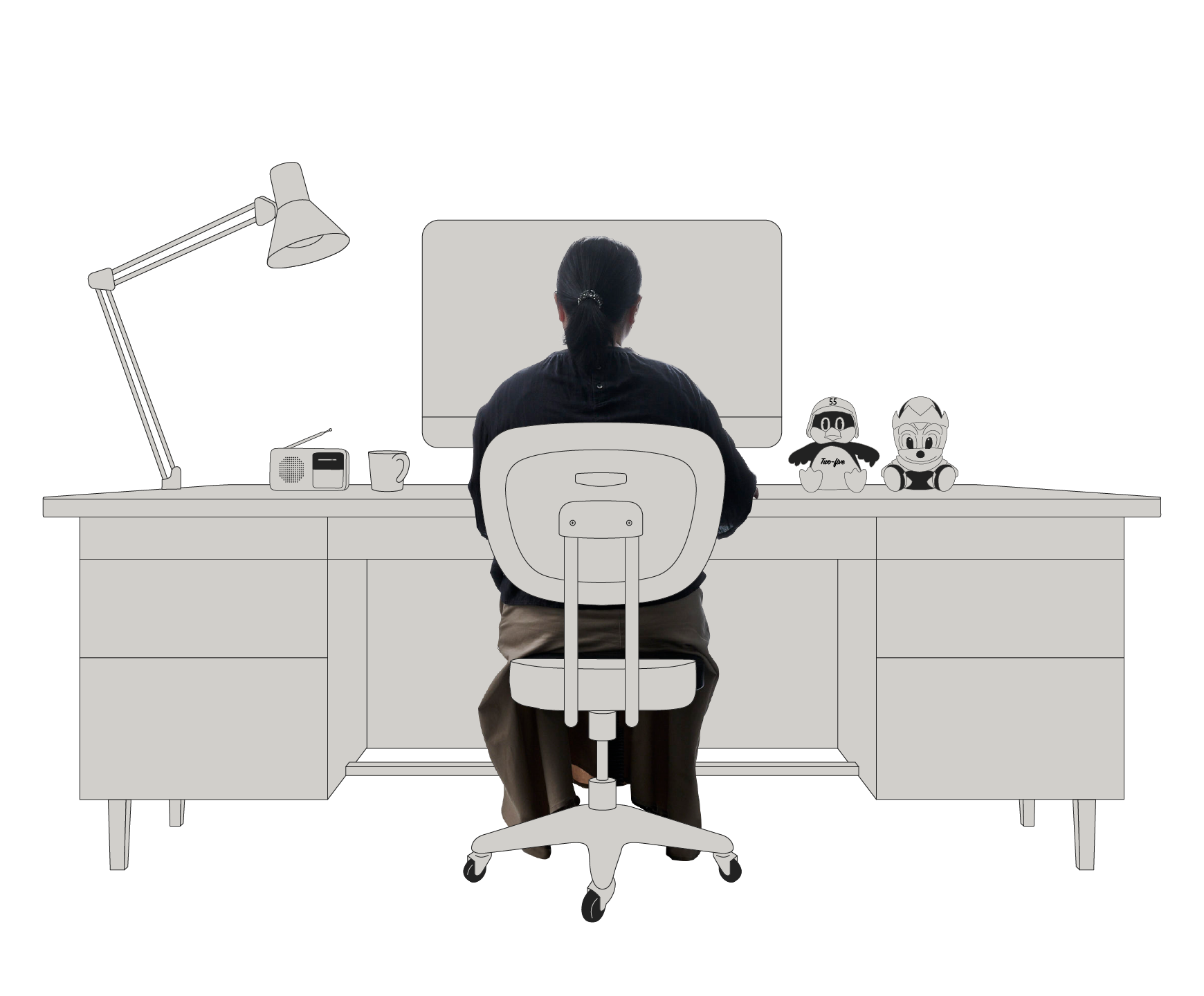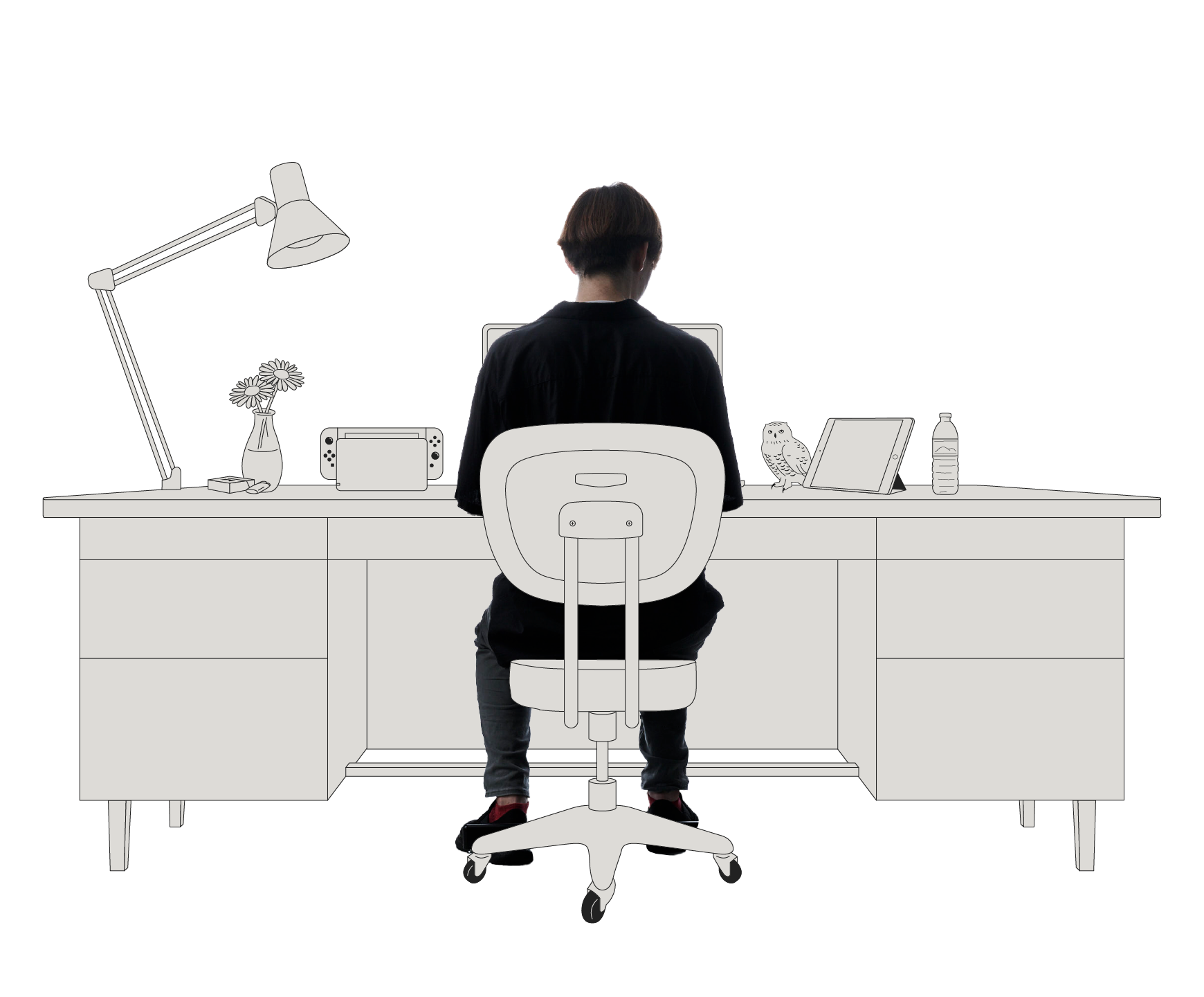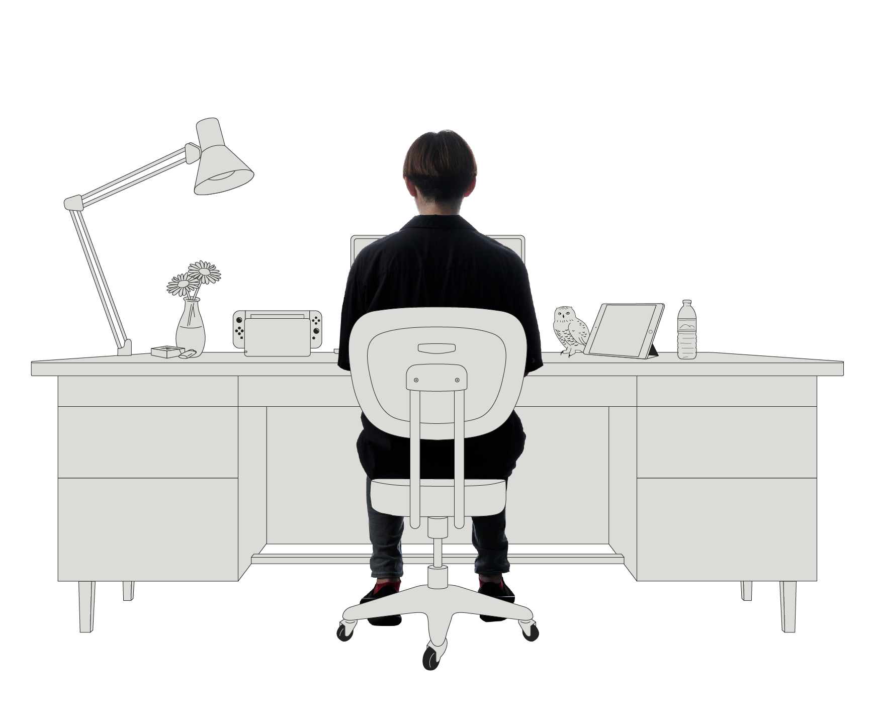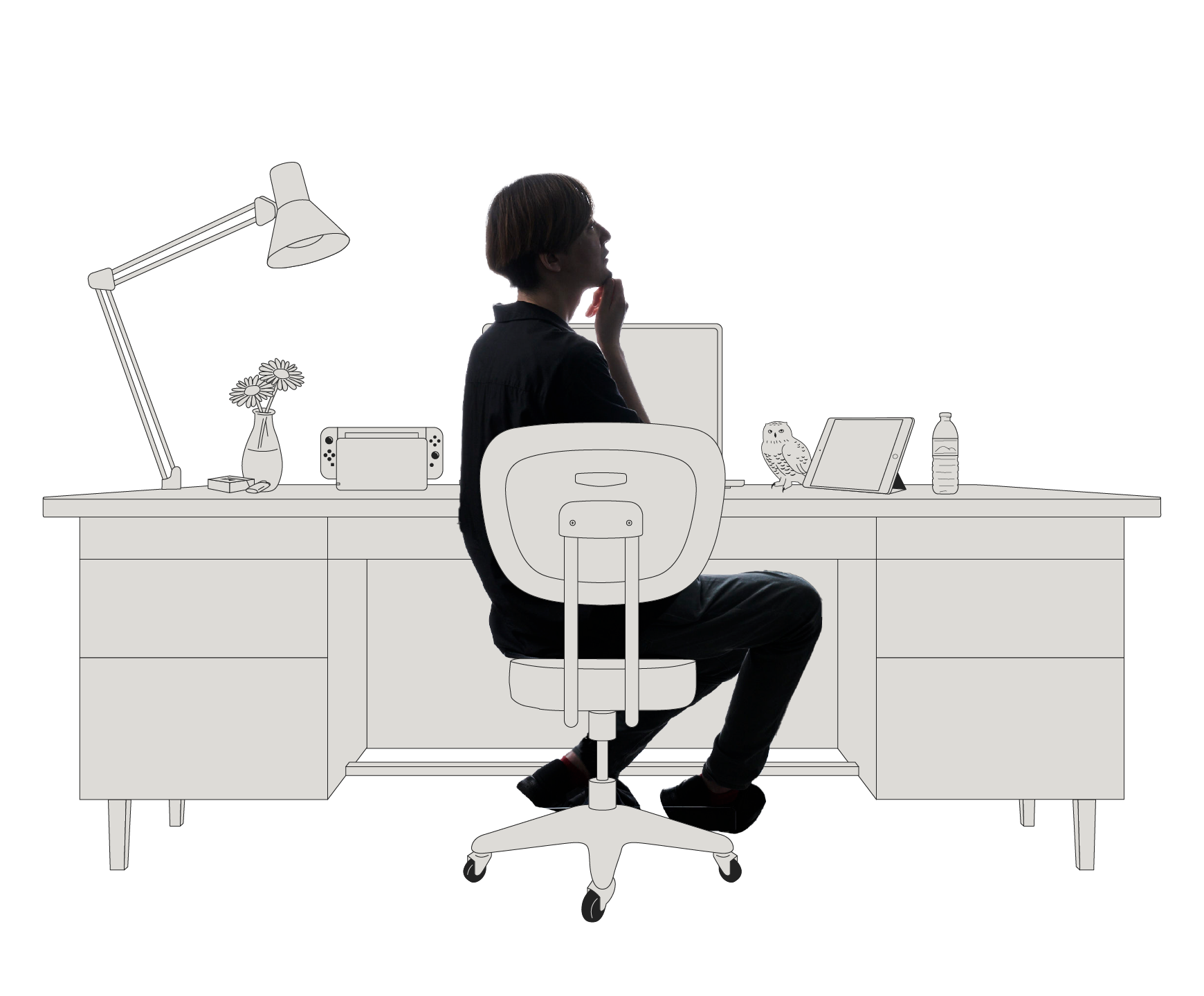 机に置かれたお気に入りのアイテムとともに働くうしろ姿を、ぜひ覗いてみてください。