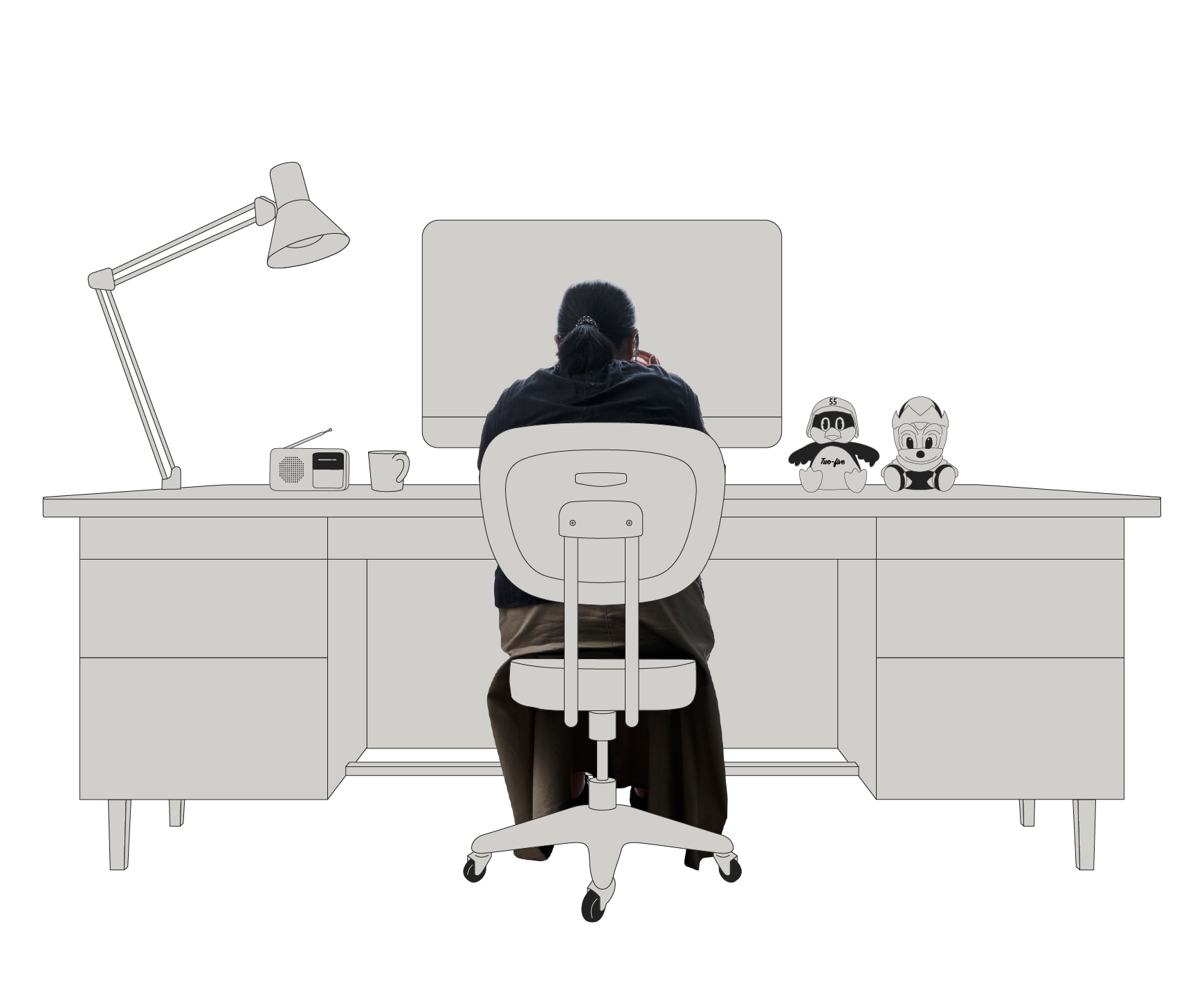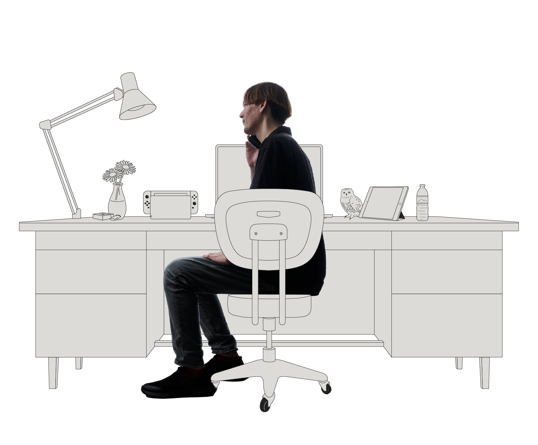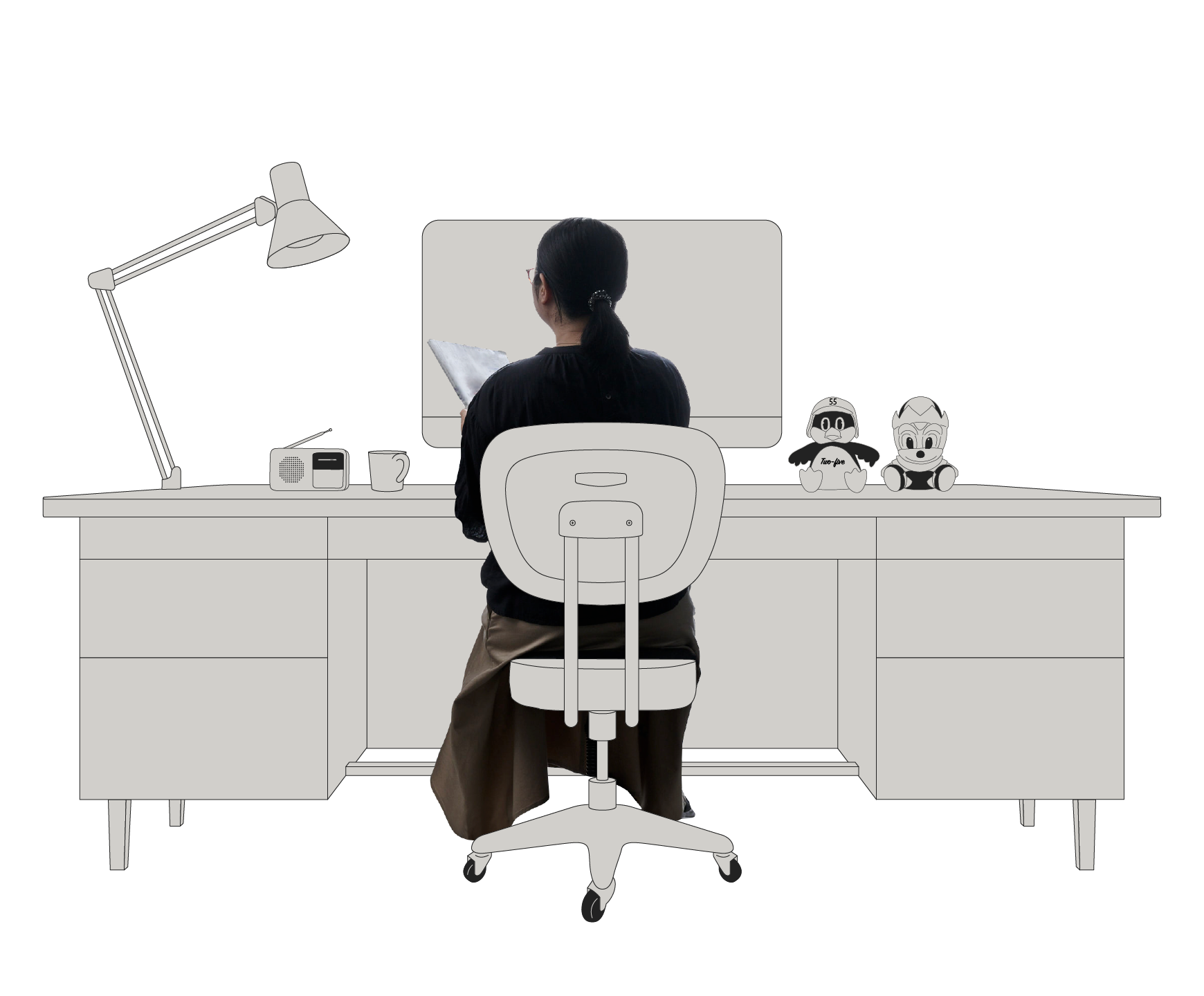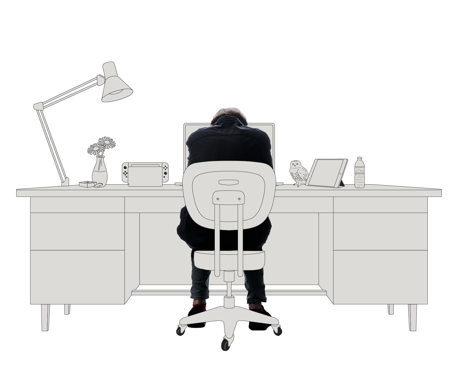 机に置かれたお気に入りのアイテムとともに働くうしろ姿を、ぜひ覗いてみてください。